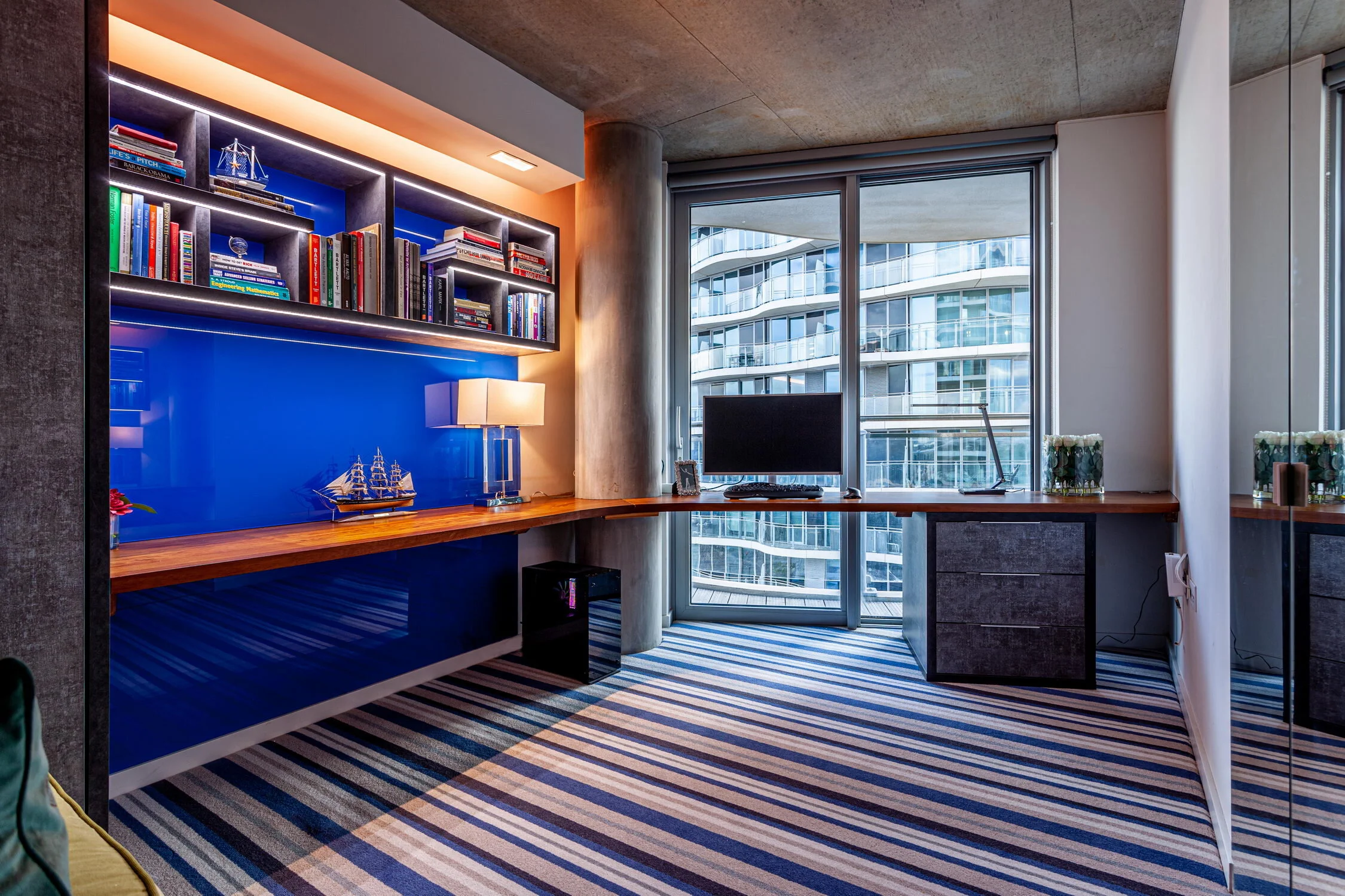 Enjoying undisturbed views of the Thames River and the O2 Arena and the city of London, this Hoola Tower apartment is in a different league from other dwellings in the tower, unaltered from their original, plain, monochromatic interior design.