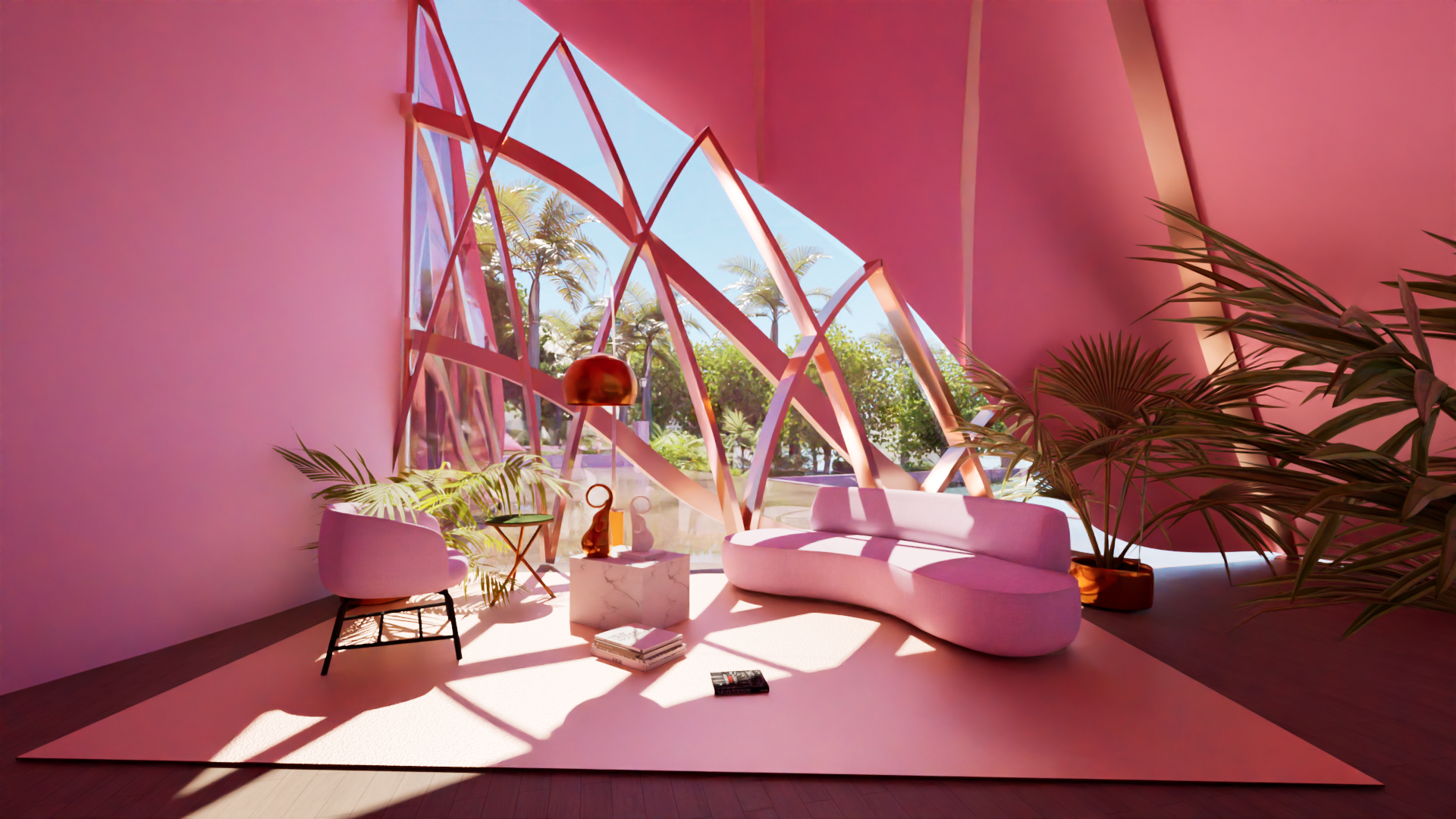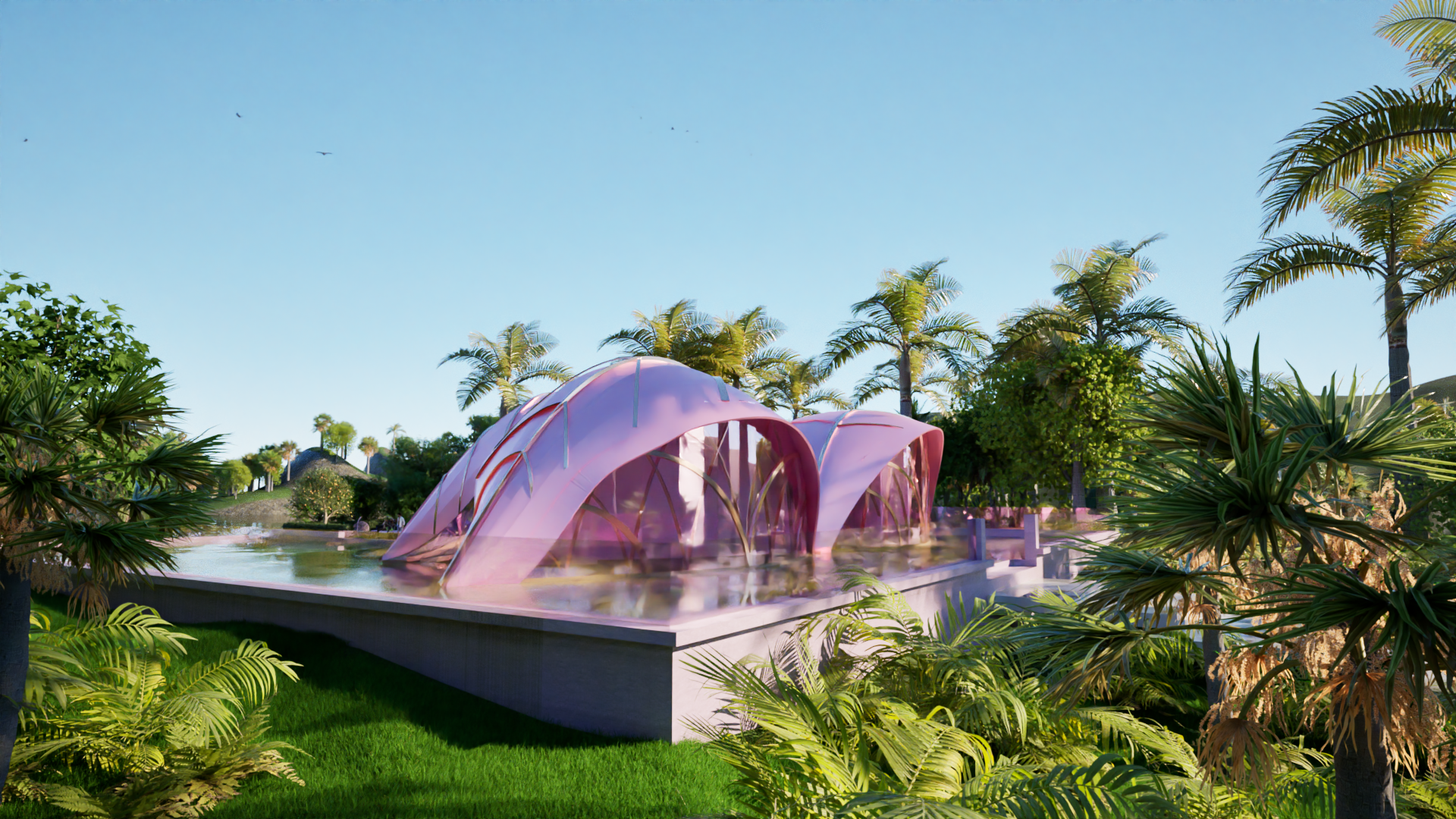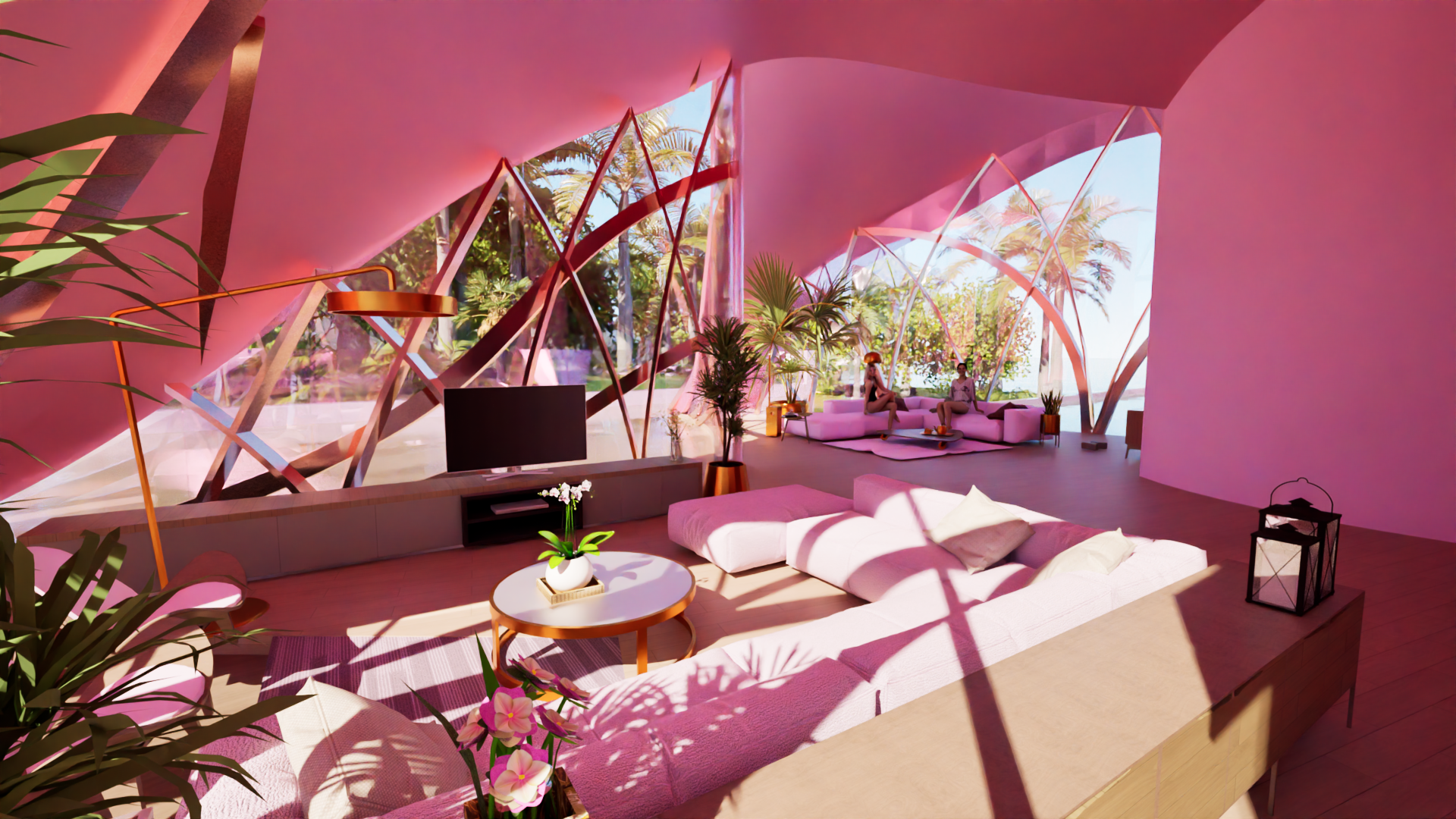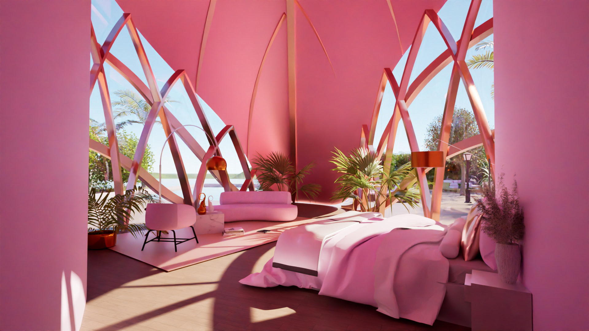 The design incorporates vibrant pink elements throughout, adding an exciting and bold contrast to the natural textures of the villa. These pink accents can be seen in both the exterior and interior, creating a playful yet sophisticated aesthetic that reflects the surrounding landscape's vitality. The color scheme, combined with the organic palm tree-inspired form, evokes a sense of warmth and energy, making the villa a striking presence in the environment.